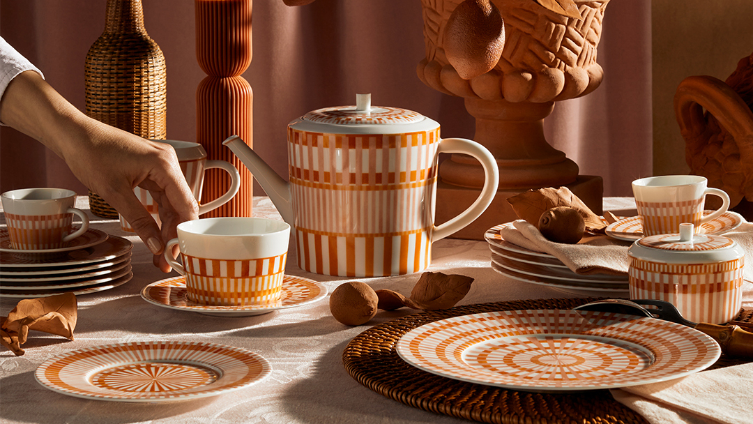 Terra Rosa is a joyful and luminous collection that takes you on a journey from the Pink City to the confines of the Atlas Mountains. With its shades of pinks and oranges, the service is reminiscent of the pastel tones of the bricks of the Pink City and the terracotta floor tiles of the Marrakech’s riads, washed out by time and sun. These colors inspired the decor: they dance and shine, with different patterns on each piece. Play with variations and create an effect of rhythm and movement for a vibrant, contemporary table!