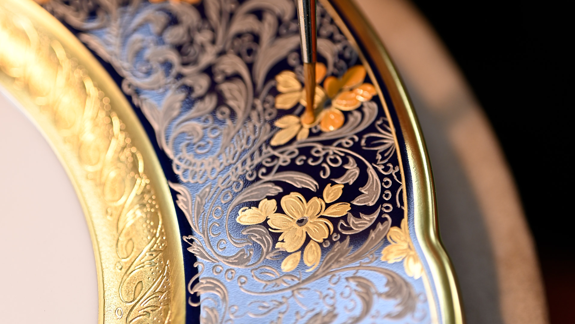 In this even more precious version of Eden, gold lace adorns the cobalt blue rim, wh...
