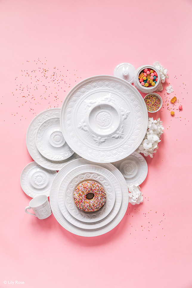 Sur une forme blanche, des motifs gravés en relief composent, au gré des pièces, un ...